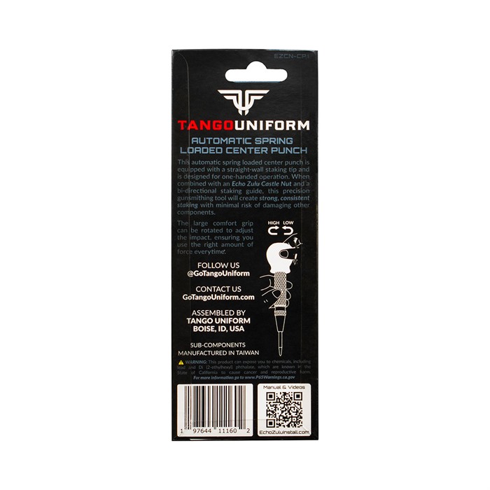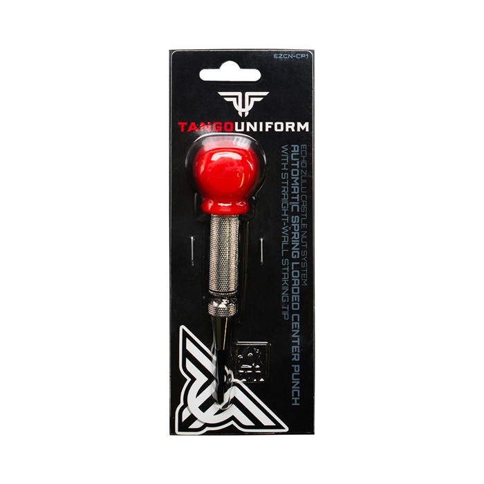 Echo Zulu Spring Loaded Center Punch Stake your AR’s castle nuts faster, safer, & more consistently with Tango Uniform’s new Echo Zulu Castle Nut System. This premium spring loaded center punch features a large, injection molded comfort grip and the knurl textured body has a chrome plated finish for a long-life. The staking punch has a straight-wall design so it won’t tilt inside the bi-directional staking guide, included in the Echo Zulu Starter Kit, or the Echo Zulu armorer’s wrench. It’s made from 17-4 stainless steel and finished in long duration, diamond hard black nitride. When combined with an Echo Zulu castle nut and a precision staking guide, this spring loaded center punch will create strong, consistent staking with minimal risk of damaging other components.