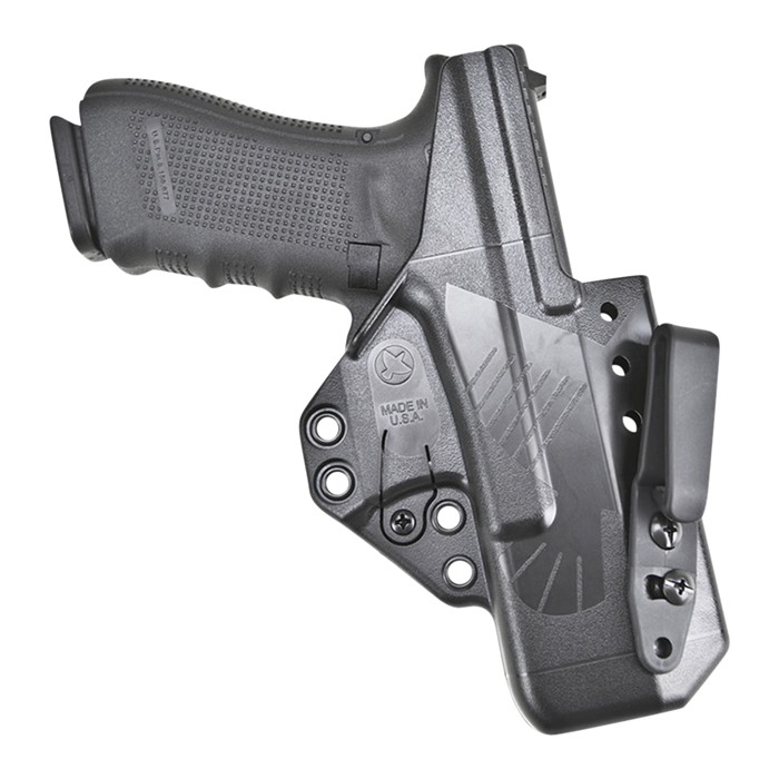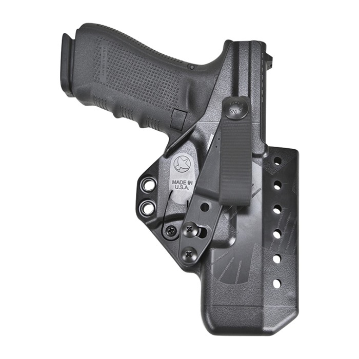 Das Glock 19/Universal Modell hat ein durchgehendes offenes Bodendesign und passt auf jede 3. oder 4. Generation Glock 9mm/.40cal Pistole. Das Holster-Gehäuse selbst ist in der Länge einer Glock 19 Pistole gleich. Es ist in kurzen oder langen Körper-Schirm-Konfigurationen erhältlich.