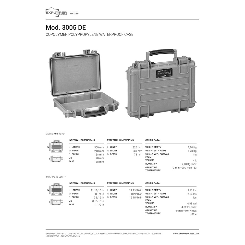 8024482181981 Der bestmögliche Schutz für Dein bestes Stück - Der ultimative Waffenkoffer mit einer Vielzahl von Funktionen in höchster Qualität, hergestellt von Explorer Cases in Italien. Spezifikationen: Länge: 326mm (300mm innen) Breite: 269mm (210mm innen) Tiefe: 75mm (58mm innen) Gewicht: 1,10kg Farbe: Schwarz Nicht zu verwüsten Die Waffenkoffer von Explorer Cases verfügen über korrosionsbeständige Metallscharniere, welche den Deckel zudem in der gewählten Position fixieren. Sei Dir sicher, dieser Waffenkoffer wird sehr lange dein Begleiter sein. Dank der hochwertigen Verschlussriegel sind die Waffenkoffer immer perfekt gesichert. Die O-Ring Dichtung macht sie zudem in hohem Maße wasserdicht. Alle Waffenkoffer sind mit einem manuellen Druckausgleichungsventil ausgestattet. Daher kannst Du sicherstellen, dass genügend Luft aus dem Gehäuse austritt, damit Du keine Probleme haben wirst, den Koffer zu schließen. Genauso wie Du es möchtest Die Gehäuse sind mit internen Aussparungen für optionale interne Halterungen oder Montageringe versehen, sodass Du alles genau so aufbewahren kannst, wie es für deine Anforderungen am geeignetsten ist. Jeder einzelne Koffer kommt mit einem wasserfesten abnehmbaren PVC-Etikett, mit welchem du deine Ausrüstung beschriften kannst oder deine Daten hinterlegen kannst. Der Koffer kann entweder traditionell über den großen Frontgriff oder über optional erhältliche Schultergurte, welche sich ganz einfach an jedem Modell befestigen lassen, transportiert werden. Die 3005 Serie ist zudem für den Transport im Flugzeug optimiert.Aus dem Programm genommen