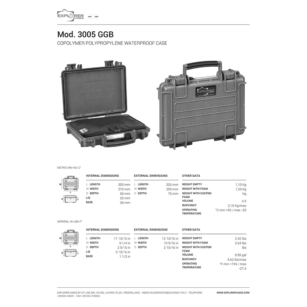 8024482183497 Der bestmögliche Schutz für Dein bestes Stück - Der ultimative Waffenkoffer mit einer Vielzahl von Funktionen in höchster Qualität, hergestellt von Explorer Cases in Italien. Spezifikationen: Länge: 326mm (300mm innen) Breite: 269mm (210mm innen) Tiefe: 75mm (58mm innen) Gewicht: 1,20kg (1,10kg Leergewicht ohne Einlage) Farbe: Schwarz Einlage: inkl. Waffentasche Nicht zu verwüsten Die Waffenkoffer von Explorer Cases verfügen über korrosionsbeständige Metallscharniere, welche den Deckel zudem in der gewählten Position fixieren. Sei Dir sicher, dieser Waffenkoffer wird sehr lange dein Begleiter sein. Dank der hochwertigen Verschlussriegel sind die Waffenkoffer immer perfekt gesichert. Die O-Ring Dichtung macht sie zudem in hohem Maße wasserdicht. Alle Waffenkoffer sind mit einem manuellen Druckausgleichungsventil ausgestattet. Daher kannst Du sicherstellen, dass genügend Luft aus dem Gehäuse austritt, damit Du keine Probleme haben wirst, den Koffer zu schließen. Genauso wie Du es möchtest Die Gehäuse sind mit internen Aussparungen für optionale interne Halterungen oder Montageringe versehen, sodass Du alles genau so aufbewahren kannst, wie es für deine Anforderungen am geeignetsten ist. Jeder einzelne Koffer kommt mit einem wasserfesten abnehmbaren PVC-Etikett, mit welchem du deine Ausrüstung beschriften kannst oder deine Daten hinterlegen kannst. Der Koffer kann entweder traditionell über den großen Frontgriff oder über optional erhältliche Schultergurte, welche sich ganz einfach an jedem Modell befestigen lassen, transportiert werden. Die 3005 Serie ist zudem für den Transport im Flugzeug optimiert.