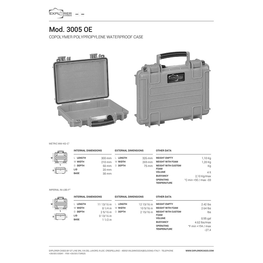 8024482181578 Der bestmögliche Schutz für Dein bestes Stück - Der ultimative Waffenkoffer mit einer Vielzahl von Funktionen in höchster Qualität, hergestellt von Explorer Cases in Italien. Spezifikationen: Länge: 326mm (300mm innen) Breite: 269mm (210mm innen) Tiefe: 75mm (58mm innen) Gewicht: 1,10kg Farbe: Schwarz Nicht zu verwüsten Die Waffenkoffer von Explorer Cases verfügen über korrosionsbeständige Metallscharniere, welche den Deckel zudem in der gewählten Position fixieren. Sei Dir sicher, dieser Waffenkoffer wird sehr lange dein Begleiter sein. Dank der hochwertigen Verschlussriegel sind die Waffenkoffer immer perfekt gesichert. Die O-Ring Dichtung macht sie zudem in hohem Maße wasserdicht. Alle Waffenkoffer sind mit einem manuellen Druckausgleichungsventil ausgestattet. Daher kannst Du sicherstellen, dass genügend Luft aus dem Gehäuse austritt, damit Du keine Probleme haben wirst, den Koffer zu schließen. Genauso wie Du es möchtest Die Gehäuse sind mit internen Aussparungen für optionale interne Halterungen oder Montageringe versehen, sodass Du alles genau so aufbewahren kannst, wie es für deine Anforderungen am geeignetsten ist. Jeder einzelne Koffer kommt mit einem wasserfesten abnehmbaren PVC-Etikett, mit welchem du deine Ausrüstung beschriften kannst oder deine Daten hinterlegen kannst. Der Koffer kann entweder traditionell über den großen Frontgriff oder über optional erhältliche Schultergurte, welche sich ganz einfach an jedem Modell befestigen lassen, transportiert werden. Die 3005 Serie ist zudem für den Transport im Flugzeug optimiert.Aus dem Programm genommen