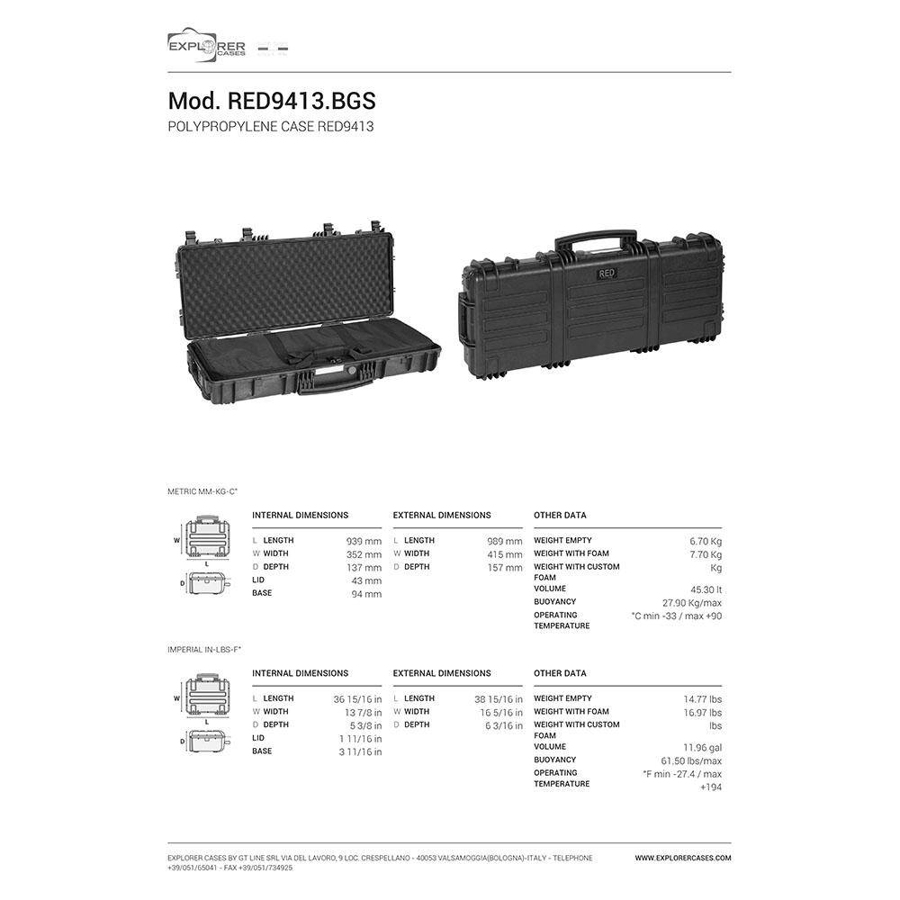8024482182964 Der bestmögliche Schutz für Dein bestes Stück - Der ultimative Waffenkoffer mit einer Vielzahl von Funktionen in höchster Qualität, hergestellt von Explorer Cases in Italien. Spezifikationen: Länge: 989mm (939mm innen) Breite: 415mm (352mm innen) Tiefe: 157mm (137mm innen) Gewicht: 7,70kg (6,70kg Leergewicht ohne Einlage) Farbe: Schwarz Einlage: inkl. Waffentasche Nicht zu verwüsten Die Waffenkoffer von Explorer Cases verfügen über korrosionsbeständige Metallscharniere, welche den Deckel zudem in der gewählten Position fixieren. Sei Dir sicher, dieser Waffenkoffer wird sehr lange dein Begleiter sein. Dank der hochwertigen Verschlussriegel sind die Waffenkoffer immer perfekt gesichert. Die O-Ring Dichtung macht sie zudem in hohem Maße wasserdicht. Alle Waffenkoffer sind mit einem manuellen Druckausgleichungsventil ausgestattet. Daher kannst Du sicherstellen, dass genügend Luft aus dem Gehäuse austritt, damit Du keine Probleme haben wirst, den Koffer zu schließen. Genauso wie Du es möchtest Die Gehäuse sind mit internen Aussparungen für optionale interne Halterungen oder Montageringe versehen, sodass Du alles genau so aufbewahren kannst, wie es für deine Anforderungen am geeignetsten ist. Jeder einzelne Koffer kommt mit einem wasserfesten abnehmbaren PVC-Etikett, mit welchem du deine Ausrüstung beschriften kannst oder deine Daten hinterlegen kannst. Der Koffer kann entweder traditionell über den großen Frontgriff oder über optional erhältliche Schultergurte, welche sich ganz einfach an jedem Modell befestigen lassen, transportiert werden. Die Mod Red 9413 Serie kann zudem auch als Rollkoffer gezogen werden.Lieferzeit ca. 3-6 Werktage.