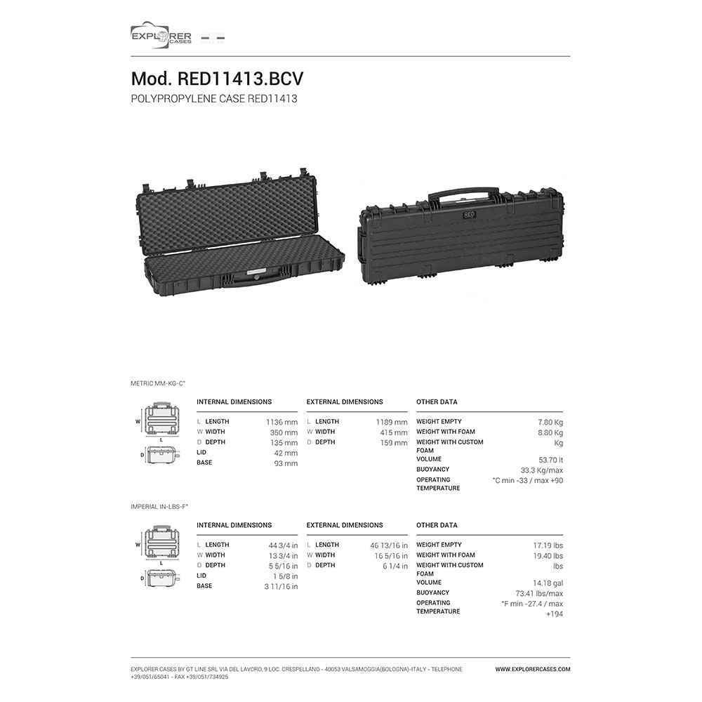 8024482182995 Der bestmögliche Schutz für Dein bestes Stück - Der ultimative Waffenkoffer mit einer Vielzahl von Funktionen in höchster Qualität, hergestellt von Explorer Cases in Italien. Spezifikationen: Länge: 1189mm (1136mm innen) Breite: 415mm (350mm innen) Tiefe: 159mm (135mm innen) Gewicht: 8,80kg (7,80kg Leergewicht ohne Einlage) Farbe: Schwarz Einlage: solider Schaumstoff Nicht zu verwüsten Die Waffenkoffer von Explorer Cases verfügen über korrosionsbeständige Metallscharniere, welche den Deckel zudem in der gewählten Position fixieren. Sei Dir sicher, dieser Waffenkoffer wird sehr lange dein Begleiter sein. Dank der hochwertigen Verschlussriegel sind die Waffenkoffer immer perfekt gesichert. Die O-Ring Dichtung macht sie zudem in hohem Maße wasserdicht. Alle Waffenkoffer sind mit einem manuellen Druckausgleichungsventil ausgestattet. Daher kannst Du sicherstellen, dass genügend Luft aus dem Gehäuse austritt, damit Du keine Probleme haben wirst, den Koffer zu schließen. Genauso wie Du es möchtest Die Gehäuse sind mit internen Aussparungen für optionale interne Halterungen oder Montageringe versehen, sodass Du alles genau so aufbewahren kannst, wie es für deine Anforderungen am geeignetsten ist. Jeder einzelne Koffer kommt mit einem wasserfesten abnehmbaren PVC-Etikett, mit welchem du deine Ausrüstung beschriften kannst oder deine Daten hinterlegen kannst. Der Koffer kann entweder traditionell über den großen Frontgriff oder über optional erhältliche Schultergurte, welche sich ganz einfach an jedem Modell befestigen lassen, transportiert werden. Die Mod Red 11413 Serie kann zudem auch als Rollkoffer gezogen werden.Lieferzeit ca. 3-6 Werktage.
