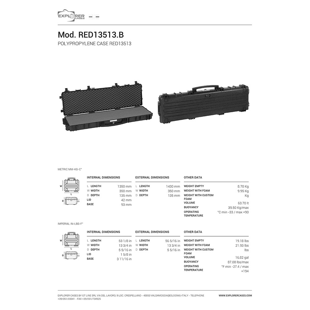 8024482182858 Der bestmögliche Schutz für Dein bestes Stück - Der ultimative Waffenkoffer mit einer Vielzahl von Funktionen in höchster Qualität, hergestellt von Explorer Cases in Italien. Spezifikationen: Länge: 1430mm (1350mm innen) Breite: 350mm (350 mm innen) Tiefe: 135mm (135mm innen) Gewicht: 9,95kg (8,70kg Leergewicht ohne Einlage) Farbe: Schwarz Einlage: vorgeschnittener Schaumstoff Nicht zu verwüsten Die Waffenkoffer von Explorer Cases verfügen über korrosionsbeständige Metallscharniere, welche den Deckel zudem in der gewählten Position fixieren. Sei Dir sicher, dieser Waffenkoffer wird sehr lange dein Begleiter sein. Dank der hochwertigen Verschlussriegel sind die Waffenkoffer immer perfekt gesichert. Die O-Ring Dichtung macht sie zudem in hohem Maße wasserdicht. Alle Waffenkoffer sind mit einem manuellen Druckausgleichungsventil ausgestattet. Daher kannst Du sicherstellen, dass genügend Luft aus dem Gehäuse austritt, damit Du keine Probleme haben wirst, den Koffer zu schließen. Genauso wie Du es möchtest Die Gehäuse sind mit internen Aussparungen für optionale interne Halterungen oder Montageringe versehen, sodass Du alles genau so aufbewahren kannst, wie es für deine Anforderungen am geeignetsten ist. Jeder einzelne Koffer kommt mit einem wasserfesten abnehmbaren PVC-Etikett, mit welchem du deine Ausrüstung beschriften kannst oder deine Daten hinterlegen kannst. Der Koffer kann entweder traditionell über den großen Frontgriff oder über optional erhältliche Schultergurte, welche sich ganz einfach an jedem Modell befestigen lassen, transportiert werden. Die Mod Red 13513 Serie kann zudem auch als Rollkoffer gezogen werden.Nachbestellt, Lieferung vom Hersteller überfällig.
