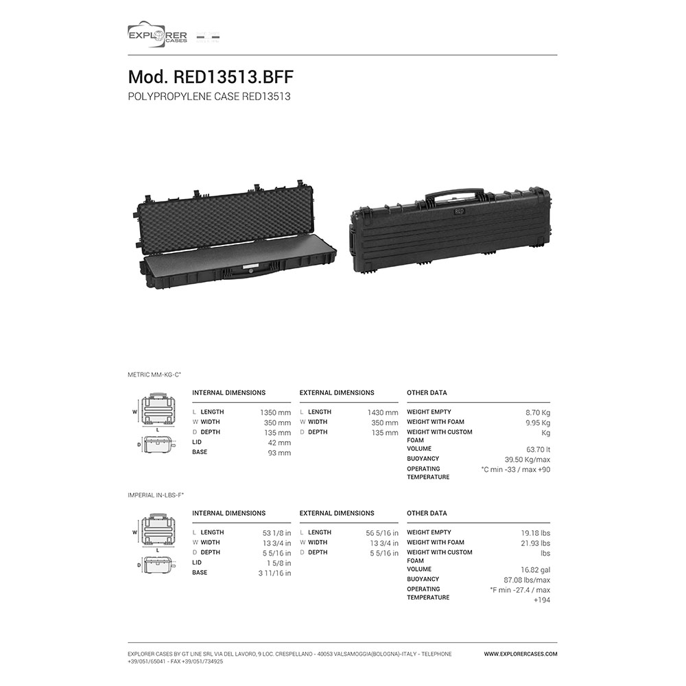 8024482183664 Der bestmögliche Schutz für Dein bestes Stück - Der ultimative Waffenkoffer mit einer Vielzahl von Funktionen in höchster Qualität, hergestellt von Explorer Cases in Italien. Spezifikationen: Länge: 1430mm (1350mm innen) Breite: 350mm (350 mm innen) Tiefe: 135mm (135mm innen) Gewicht: 9,95kg (8,70kg Leergewicht ohne Einlage) Farbe: Schwarz Einlage: Schaumstoff zum selber schneiden Nicht zu verwüsten Die Waffenkoffer von Explorer Cases verfügen über korrosionsbeständige Metallscharniere, welche den Deckel zudem in der gewählten Position fixieren. Sei Dir sicher, dieser Waffenkoffer wird sehr lange dein Begleiter sein. Dank der hochwertigen Verschlussriegel sind die Waffenkoffer immer perfekt gesichert. Die O-Ring Dichtung macht sie zudem in hohem Maße wasserdicht. Alle Waffenkoffer sind mit einem manuellen Druckausgleichungsventil ausgestattet. Daher kannst Du sicherstellen, dass genügend Luft aus dem Gehäuse austritt, damit Du keine Probleme haben wirst, den Koffer zu schließen. Genauso wie Du es möchtest Die Gehäuse sind mit internen Aussparungen für optionale interne Halterungen oder Montageringe versehen, sodass Du alles genau so aufbewahren kannst, wie es für deine Anforderungen am geeignetsten ist. Jeder einzelne Koffer kommt mit einem wasserfesten abnehmbaren PVC-Etikett, mit welchem du deine Ausrüstung beschriften kannst oder deine Daten hinterlegen kannst. Der Koffer kann entweder traditionell über den großen Frontgriff oder über optional erhältliche Schultergurte, welche sich ganz einfach an jedem Modell befestigen lassen, transportiert werden. Die Mod Red 13513 Serie kann zudem auch als Rollkoffer gezogen werden.