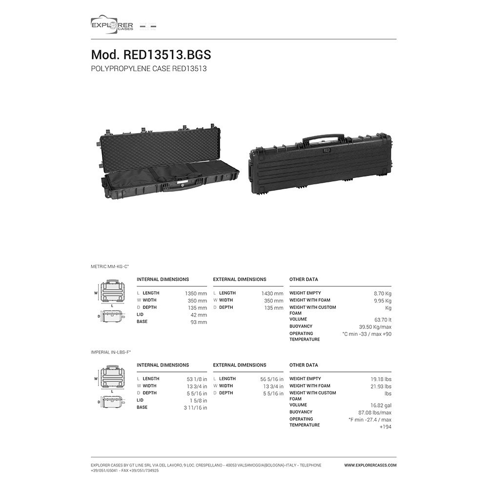 8024482182988 Der bestmögliche Schutz für Dein bestes Stück - Der ultimative Waffenkoffer mit einer Vielzahl von Funktionen in höchster Qualität, hergestellt von Explorer Cases in Italien. Spezifikationen: Länge: 1430mm (1350mm innen) Breite: 350mm (350 mm innen) Tiefe: 135mm (135mm innen) Gewicht: 9,95kg (8,70kg Leergewicht ohne Einlage) Farbe: Schwarz Einlage: inkl. Waffentasche Nicht zu verwüsten Die Waffenkoffer von Explorer Cases verfügen über korrosionsbeständige Metallscharniere, welche den Deckel zudem in der gewählten Position fixieren. Sei Dir sicher, dieser Waffenkoffer wird sehr lange dein Begleiter sein. Dank der hochwertigen Verschlussriegel sind die Waffenkoffer immer perfekt gesichert. Die O-Ring Dichtung macht sie zudem in hohem Maße wasserdicht. Alle Waffenkoffer sind mit einem manuellen Druckausgleichungsventil ausgestattet. Daher kannst Du sicherstellen, dass genügend Luft aus dem Gehäuse austritt, damit Du keine Probleme haben wirst, den Koffer zu schließen. Genauso wie Du es möchtest Die Gehäuse sind mit internen Aussparungen für optionale interne Halterungen oder Montageringe versehen, sodass Du alles genau so aufbewahren kannst, wie es für deine Anforderungen am geeignetsten ist. Jeder einzelne Koffer kommt mit einem wasserfesten abnehmbaren PVC-Etikett, mit welchem du deine Ausrüstung beschriften kannst oder deine Daten hinterlegen kannst. Der Koffer kann entweder traditionell über den großen Frontgriff oder über optional erhältliche Schultergurte, welche sich ganz einfach an jedem Modell befestigen lassen, transportiert werden. Die Mod Red 13513 Serie kann zudem auch als Rollkoffer gezogen werden.Lieferzeit ca. 3-6 Werktage.