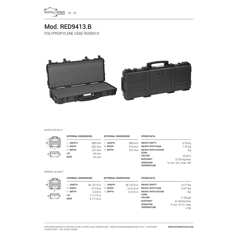 8024482182889 Der bestmögliche Schutz für Dein bestes Stück - Der ultimative Waffenkoffer mit einer Vielzahl von Funktionen in höchster Qualität, hergestellt von Explorer Cases in Italien. Spezifikationen: Länge: 989mm (939mm innen) Breite: 415mm (352mm innen) Tiefe: 157mm (137mm innen) Gewicht: 7,70kg (6,70kg Leergewicht ohne Einlage) Farbe: Schwarz Einlage: vorgeschnittener Schaumstoff Nicht zu verwüsten Die Waffenkoffer von Explorer Cases verfügen über korrosionsbeständige Metallscharniere, welche den Deckel zudem in der gewählten Position fixieren. Sei Dir sicher, dieser Waffenkoffer wird sehr lange dein Begleiter sein. Dank der hochwertigen Verschlussriegel sind die Waffenkoffer immer perfekt gesichert. Die O-Ring Dichtung macht sie zudem in hohem Maße wasserdicht. Alle Waffenkoffer sind mit einem manuellen Druckausgleichungsventil ausgestattet. Daher kannst Du sicherstellen, dass genügend Luft aus dem Gehäuse austritt, damit Du keine Probleme haben wirst, den Koffer zu schließen. Genauso wie Du es möchtest Die Gehäuse sind mit internen Aussparungen für optionale interne Halterungen oder Montageringe versehen, sodass Du alles genau so aufbewahren kannst, wie es für deine Anforderungen am geeignetsten ist. Jeder einzelne Koffer kommt mit einem wasserfesten abnehmbaren PVC-Etikett, mit welchem du deine Ausrüstung beschriften kannst oder deine Daten hinterlegen kannst. Der Koffer kann entweder traditionell über den großen Frontgriff oder über optional erhältliche Schultergurte, welche sich ganz einfach an jedem Modell befestigen lassen, transportiert werden. Die Mod Red 9413 Serie kann zudem auch als Rollkoffer gezogen werden.Nachbestellt, Lieferung vom Hersteller überfällig.