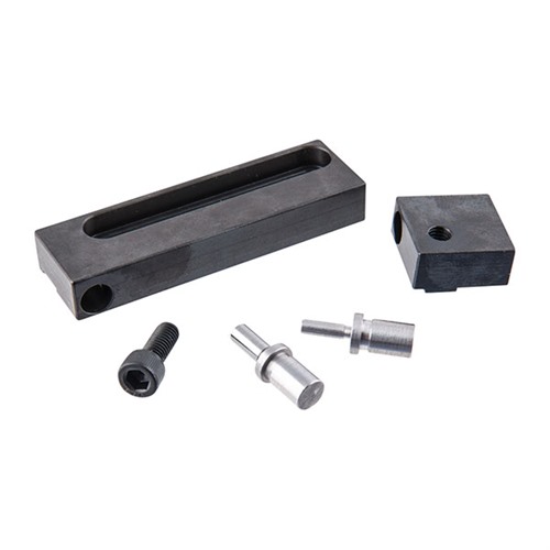 Der Block akzeptiert eine breite Auswahl an Hammer- und Sear-Pins, die für verschiedene Handfeuerwaffen und Gewehre geeignet sind. Der dovetailed adjustment block gleitet in einem geschlitzten Kanal, sodass der Abstand der Pins präzise auf die individuellen Rahmen und Empfänger eingestellt werden kann. Ein Allen-Schraube sichert die Pin-Einstellung, sodass Hammer und Sear in ihre tatsächliche Position in der Feuerwaffe eingesetzt werden können.
