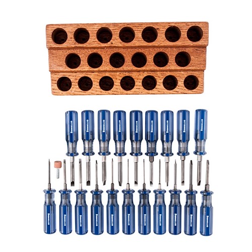 Um die hervorragende Qualität der Schraubendreher zu unterstreichen, haben wir zwei wunderschöne Solid Oak Bench Blocks entworfen, die deine Fixed-Blade Gunsmith's Screwdrivers halten. Jeder Block hat 3 Ebenen, sodass sie kompakt sind und du sowohl die Breite/Dicke des Blattes als auch die Identifikationsnummer auf der flachen Seite des freiliegenden Sechskants sehen kannst. Die 20 Löcher (Master Block) oder 10 Löcher (Add-On Block) sind weit genug auseinander für eine gute Fingerfreiheit.