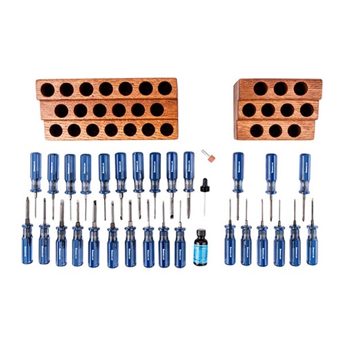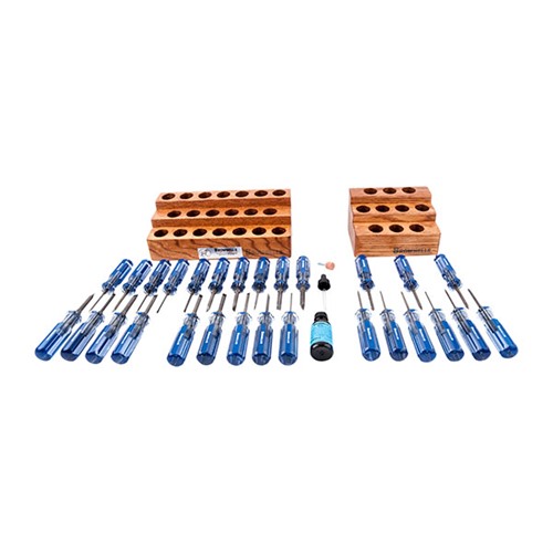 Wir haben die Schraubendreher auf zwei Arten verpackt: Das Master Set™ enthält alle 20 Schraubendreher, plus den richtig gerundeten Bit Shaping Stone, den Bankblock und eine Flasche Brownells Best Penetrating Oil™. Um das Super Master Set™ zu erstellen, haben wir das Master Set genommen und 6 Schraubendreher mit Innensechskant, 3 Phillips "Anti-Cam"-Schraubendreher und den Add-On Block hinzugefügt. Wie bei all unseren Werkzeugen und Zubehör ist garantiert, dass sie dir, dem anspruchsvollsten Handwerker der Welt – dem arbeitenden Gunsmith – Freude bereiten.