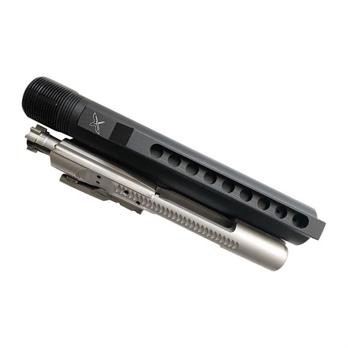 Der RE5F besteht aus schlagextrudiertem 7075 Aluminium mit gewalzten Gewinden. Das Innere ist mit einem Trockenschmierfilm versehen, der Durchmesser des Gehäuses entspricht dem Mil-Spec-Standard, was die Kompatibilität mit allen Mil-Spec-Karabinerstöcken gewährleistet. Zudem verfügt er über zusätzliche Ablauflöcher, um Wasser im Inneren der Receiver Extension besser und schneller abzulassen.