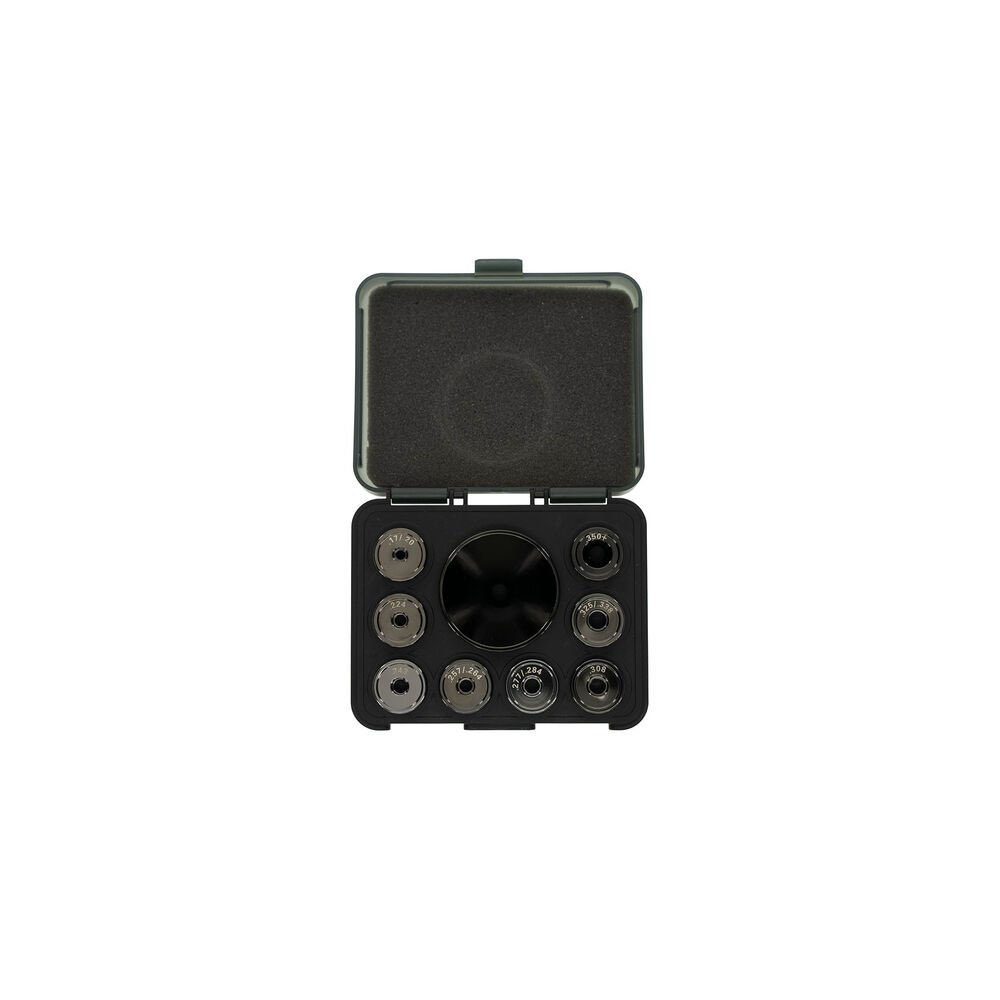 Das mitgelieferte Aufbewahrungsetui mit Scharnierdeckel organisiert den Trichter und die lasergravierten Düsen, sodass du sie leicht identifizieren kannst.