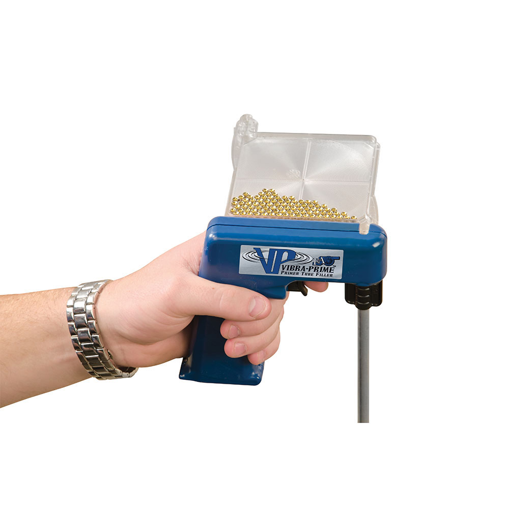 Der Vibra-Prime™ kann in Sekundenschnelle 100 Primer in eine Primer-Röhre laden, dank seines einzigartigen motorisierten Agitationsmechanismus. Befüllte Röhren lassen sich anschließend mühelos in jede Art von progressiver Presse übertragen.