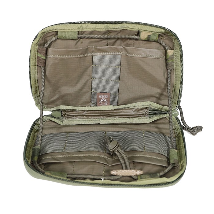 Grey Ghost Gear's latest Admin Pouch Enhanced is now thinner and made from Laminate nylon, which means it's lighter and more streamlined than ever before! Attaches to modular webbing with the two included Malice Clips®. The front of the pouch is covered in modular webbing as well as loop material for attaching name tapes or patches. The interior features a pocket and multiple elastic loops for storing smaller items like pens, lighters small multitools and batteries. The adjustable cord allows the pouch to open completely or as a desk while a heavy duty dual pull zipper keeps things secure. Available in Black, Coyote Brown and MultiCam. Materials: 500-D Cordura Laminated Nylon 1.5" Heavy Elastic Loop Panel Injection molded Malice Clips® Dimensions: 8" x 5.4" x 3.4"