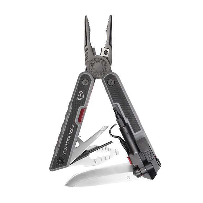 Welcome to a new breed of firearm multitools. Whether you own a .22 caliber rifle for plinking, a 12 gauge shotgun for hunting, a 9MM for protection, or anything in-between- this multitool is for you. Packed with precision-made, mission-specific tools for hunters and shooters, this highly versatile tool repairs, customizes and makes disassembly and reassembly fast and easy. The Gun Tool Max functions as impressively on the gun cleaning mat as it does in the range, at deer camp or in the duck blind. It’s built to kick Murphy’s Law in the teeth, face uncertainty and prepare you for whatever is around the corner. It is the next generation of multitools and it belongs at your side. COMBINATION NEEDLE-NOSE PLIERS REPLACEABLE CARBIDE CUTTER OVERSIZED FLAT HEAD SCREWDRIVER TAP HAMMER (ON REVERSE SIDE) BIT DRIVER INCLUDES 12 BITS: T10 TORX, T15 TORX,T20 TORX, #00 PHILLIPS, #1 PHILLIPS, #2 PHILLIPS, 3/32″ FLAT, 3/16″ FLAT, 5/32 ALLEN, 9/64″ ALLEN, 1/8 ALLEN, 3/32″ ALLEN 3-POSITION LOCKING BIT DRIVER 3.25″ 440 STAINLESS STEEL DROP POINT BLADE DETACHABLE PICK 8-32 THREADED POST FITS STANDARD GUN CLEANING RODS, CABLES, BRUSHES AND IMPLEMENTS SCOPE TURRET TOOL UNIVERSAL CHOKE WRENCH FITS .410, 28, 20, 16, 12, 10 GA. WRENCHES 4MM, 5MM, 1/4″, 3/8″ ROUND CARBON SCRAPER BOTTLE OPENER FLAT CARBON SCRAPER 3/323″ DETACHABLE PIN PUNCH 8-32 THREADED RECEIVER FITS STANDARD GUN CLEANING RODS, CABLES, BRUSHES AND IMPLEMENTS HIGH-STRENGTH STAINLESS STEEL FRAME G10 NON-SLIP GRIP PLATES Packed with precision-made, gun-specific tools for hunters and shooters, this highly versatile multi-tool repairs, customizes and makes disassembly and reassembly fast and easy. Included are needle-nose pliers with carbide cutter, a universal choke tube wrench, 3-position locking bit driver and a heavy-duty 440 stainless steel knife. The ballistic nylon sheath carries 12 additional bits for added functionality. It’s a whole new breed of Gun Tool.