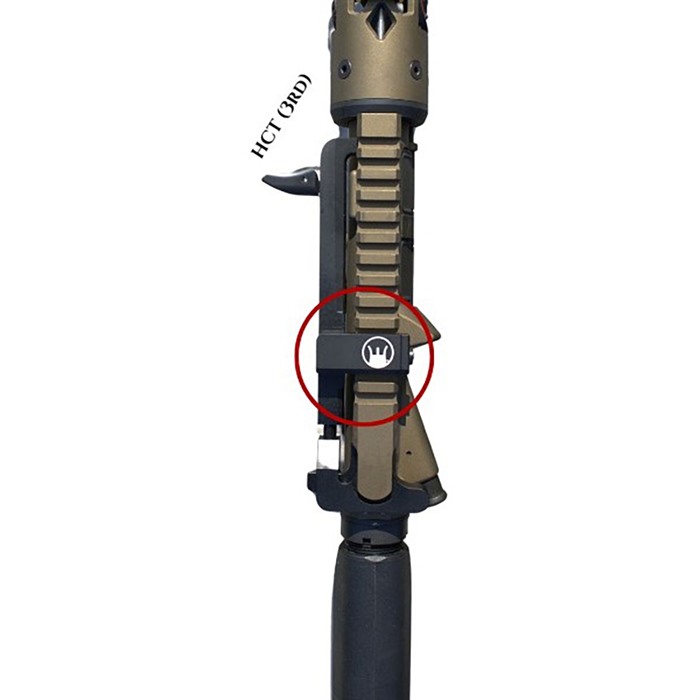 Der HCT (Hard Charger® Tactical) wird an der 3. Picatinny-Schiene montiert und ist für Standard, Forged, Mil-Spec Typ obere Empfänger konzipiert. Dieses Design wird zwischen einem Backup Visier und einer nach vorne montierten Optik montiert.