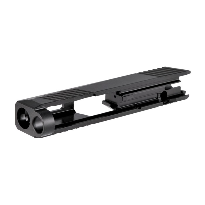 Perfect "Top Half" for a D.I.Y. Custom Pistol - Available with Window OR Wraparound Front Serrations The Brownells Iron Sight Slide for Sig P365 Compact enables you to build a custom Sig P365-style pistol with a slide that sports distinctive cocking serrations. The front serrations aid in manipulating the slide, especially for quick chamber checks AND for clearing the occasional jam (caused by problem ammo, of course!). You can get your Brownells Iron Sight Slide for Sig P365 Compact with a solid top OR a window cutout on top between the front side serrations. The window aids in heat dissipation to keep the barrel cool during extended fire. If you have an aftermarket barrel with a contrasting finish and / or fluting, spirals, "flames," or some other a unique exterior pattern, the window also shows off a bit of your pistol's bling. Accepts Sig P365 internal parts Factory cuts for iron sights Sturdy machined 17-4 stainless steel Hardened to Rockwell "C" 41-44 for superb wear resistance Durable, non-reflective matte Black Nitride finish Like all Brownells slides, the Iron Sight model for Sig P365 Compact is precision machined from solid 17-4 stainless steel billet to factory specifications inside so it is compatible with any factory or aftermarket P365 internal components. Outside, there's a Sig factory rear sight dovetail and a standard Sig front sight dovetail cut ready for any factory or aftermarket sights you choose. This is the perfect companion "top-half" for a custom pistol build.