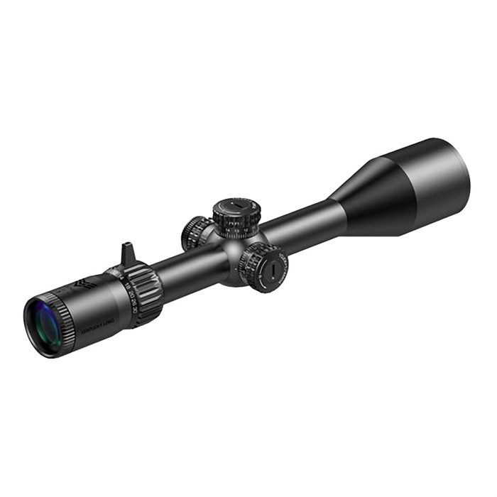 This precision riflescope series boasts first focal plane, glass etched illumination, and each scope in this series has a monster zoom ratio of 6x. Turrets are locking and zero re-settable. Includes includes high quality flip caps, 3" sun shade, and both low- and high-profile throw fins. You demand great glass, a smart FFP reticle, and adjustable parallax; but that’s not enough. You want reticle illumination for low light situations and locking, zero-resettable target turrets. You want a ton of zoom– top magnification 6 times greater than the starting point. You’ll get all that and even more when you step up to Kentucky Long. Illuminated first focal plane reticle Included high and low profile magnification lever Fast Focus Eyepiece Adjustable Parallax from 10 yards to infinity 120 MOA/34 MIL of total internal adjustment Locking Turrets Includes short and tall magnification throw fins, flip up lens caps, scope cloth, and 3" Sunshade.