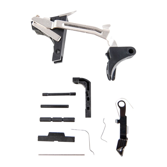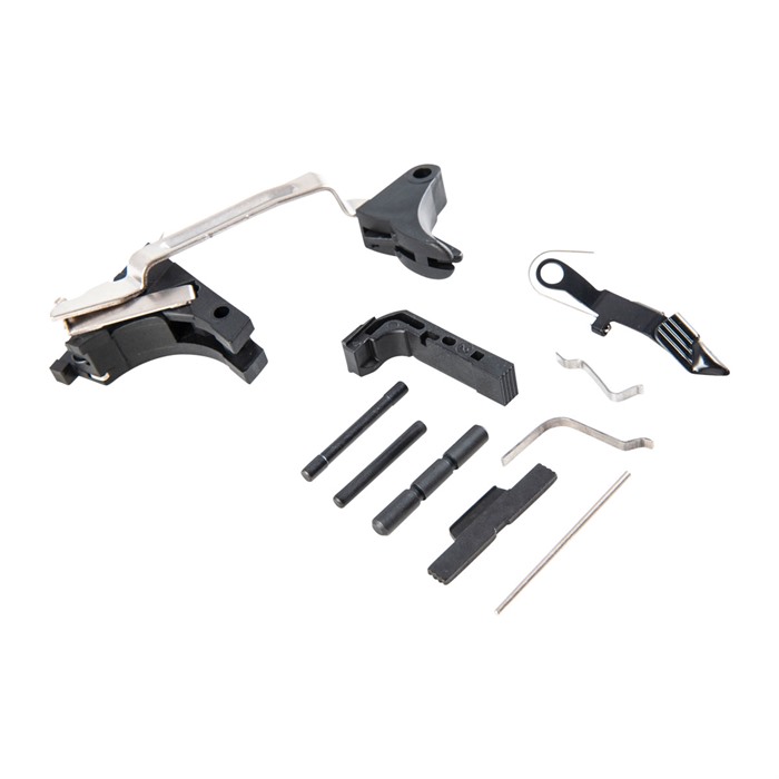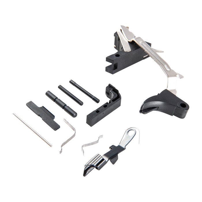 - Stelle sicher, dass du alle Teile des Kits hast: Abzug, Connector, 3PinSet, Magazinhalter, Schlittenfang, Schlittenstop, Magazinhalterfeder und Schlittenfangfedern für G17 und G19.