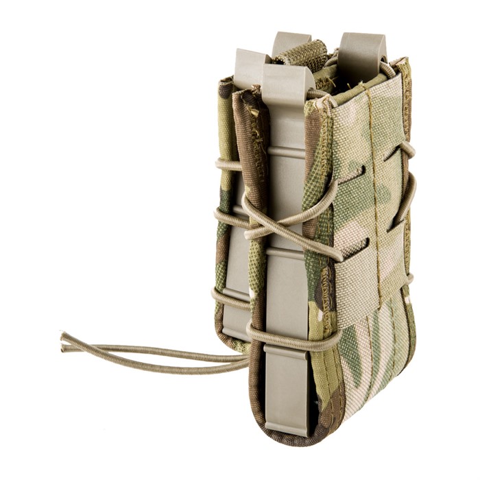 High Speed Gear’s Double Decker TACO® magazine carrier combines their modular rifle mag pouch and a modular pistol mag pouch into one secure unit. This unique pouch can securely hold a variety of combinations of mags and other accessories. The original TACO® forms the base and USGI, HK, PMAG, ARC, FAL, AK 30/ 40, LR20 and M14 magazines are all held securely and deployed easily and silently on demand. The HSGI TACO® even works for certain radios, flash bangs and smoke grenades providing versatility while taking up only 3” horizontal inches on your platform. On top, they attached a Pistol TACO®. This versatile pouch will hold almost any pistol magazine. Single stack, double stack; it makes no difference. 1911, HK 45, M9/Beretta 92, Glock, XD mags are all held securely and deployed easily and silently on demand. The HSGI Pistol Taco® can also hold a variety of multi-tools and flashlights. Both Taco pouches are made of Cordura, an injection molded polymer and shock-cord. The pouches both maintain a positive, adjustable grip of the mag and do not require any other securing systems unless desired. Webbing tabs are sewn in on the top for use of "over the top" bungee retainers (not included). Additional loop Velcro® is sewn in the inside of the rifle pouch if the user wishes to utilize adhesive backed hook Velcro on their magazine body for added security.