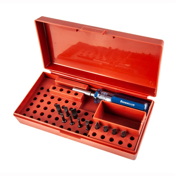 BROWNELLS STANDARD MAGNA-TIP SETS The Brownells Standard Magna-Tip® Sets are meticulously designed to meet the diverse needs of gunsmiths and firearm enthusiasts, offering a comprehensive selection of interchangeable bits and handles for precise firearm maintenance and assembly. Key Features: Comprehensive Bit Selection: Each set includes eleven bits for slotted screws, #1, #2, and #3 Phillips bits, plus ten hex bits for socket head screws, ensuring versatility across various firearm applications. True Hollow-Ground Bits: The Magna-Tip® bits feature true hollow-ground tips that transmit torque evenly and smoothly up the shank, providing complete metal-to-metal contact with the screw slot. This design allows maximum power to be exerted without damaging the screw. Durable Construction: Manufactured from high-quality materials, these bits are built to withstand rigorous use, ensuring long-lasting performance. Ergonomic Handle Design: The handle is made from shockproof plastic with grooved flutes for a positive grip, allowing for comfortable and controlled use during firearm maintenance tasks. Shockproof plastic with grooved flutes Specifications: #1 Standard Kit Includes the Magna-Tip handle of your choice. 24 bits. 11 slotted, 3 Phillips, & 10 hex bits. Includes the box and tray for organized storage and easy access. #2 Standard Kit Includes the Magna-Tip handle of your choice. 24 bits. 11 slotted, 3 Phillips, & 10 hex bits. #3 Standard Kit Includes the Magna-Tip handle of your choice. 11 slotted bits. Included the box and tray for organized storage and easy access. Customer Insights: Our customers appreciate the Brownells Standard Magna-Tip® Sets for their versatility and precision. The comprehensive selection of bits allows Customers to tackle a wide range of firearm maintenance tasks with confidence. The true hollow-ground design ensures a secure fit in screw slots, minimizing the risk of damage during use.The durable construction and ergonomic handle design contribute to a comfortable and reliable user experience, making these sets a valuable addition to any gunsmith's toolkit. Incorporating the Brownells Standard Magna-Tip® Set into your firearm maintenance routine ensures you have the right tools to perform tasks with precision and confidence. Their specialized design and robust construction make them essential for achieving professional results in gunsmithing.
