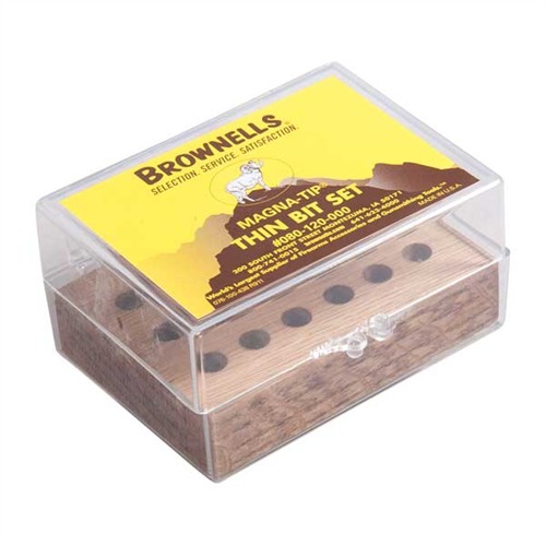 Das MAGNA-TIP® THIN-BIT SET von BROWNELLS bietet dir achtzehn unglaublich dünne Bits, die perfekt auf die extra-narrow Schraubenschlitze abgestimmt sind, die du häufig in der Waffenwerkstatt antriffst.