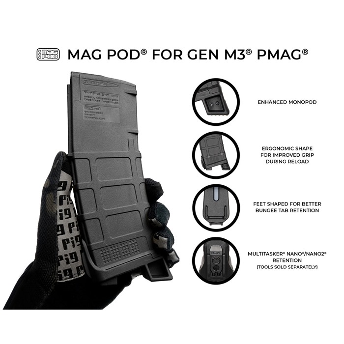 Der MAGPOD für Gen3 PMAG ist ein patentierter Monopod/Nachladehilfe, die jetzt für das Gen M3 PMAG® von Magpul erhältlich ist. Mit einer neuen, verbesserten ergonomischen Form bietet er einen sicheren Docking-Schlitz für das 1-teilige NANO® oder NANO2 von Multitasker® (Werkzeug separat erhältlich).