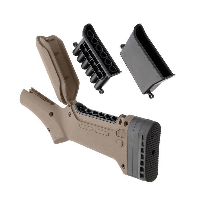 The ELG M-LOK Stock is designed to provide Marlin lever-action rifle shooters a stock with maximum adaptability that optimizes their iconic firearm. With adjustable length-of-pull (LOP) and comb height for various types of optics, storage of extra ammunition or accessories in a weatherized portion of the stock, and the ability to attach various Magpul M-LOK accessories and slings, Magpul brings new capability to the lever- action rifle. The stock allows for a one and a half (1.5”) inches of overall LOP adjustment (from 12.5” to 14.0” in 0.5” increments. The stock ships with a cheek riser and 2 x 0.25” shims for a total comb height adjustment of 0.75”, which attaches to the internal storage compartment door. The stock has an internal storage area, complete with a quiver for six (6) .45-70 Gov’t or 30-30 Win cartridges, and an open storage compartment insert. The stock also accepts Type 1 or Type 2 QD cups for a mounting a sling, and two (2) M-LOK slots reside on each side of the stock for further accessory mounting options such as an ammo saddle. Rounding out the stock’s state-of-the-art feature set is a sling swivel located in the bottom of the pistol grip which allows for shorter slings and a higher muzzle-down carry option. Adjustable LOP (1.5” total adjustability in 0.5” increments) and comb height (0.75” total adjustability in 0.25” increments) On-board ammo storage that is modifiable to other storage needs Includes both a quiver for six (6) .45-70 Gov’t or 30-30 Win cartridges and an open storage compartment insert M-LOK slots for accessories Proprietary recoil pad Sling-swivel on pistol grip allows for easy carry COMPATIBILITY - The stock is compatible with the Marlin 1895, 1894, and 336 receivers. Pre-Ruger® and Remington-built Marlin rifles are compatible with this stock. Cheek Height Adjustment Range - Adjustable by 1/4" increments to 0.75" with cheek riser and spacers LOP Adjustment Range - 12.5" - 14.0", in half-inch increments Length - 12.4 in. Length, max -13.9 in. Height, max - 5.2 in. Weight - 1.25 lbs, at max LOP and no cheek risers Width, max - 1.5 in.