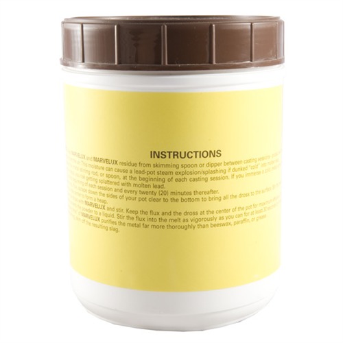 However, once I tried a jar of Marvelux I have never used anything else. It is a coarse granular powder that stays on top of the lead. It doesn't take a lot of material to do the job and a one pound jar last a long time. Once stirred in it helps the metals blend and the impurities to bond together and rise to the top where they are easily skimmed off. It doesn't smoke and ignite and does a far better flux job than wax. The powder does tend to cake in the jar, but it is easily broken up with a spoon. I read one negative post about Marvelux causing rust and I honestly don't know what he is talking about, if anything it keeps my pot clean and free from buildup and certainly no rust. If you haven't tried this product then you are still doing things the hard way.