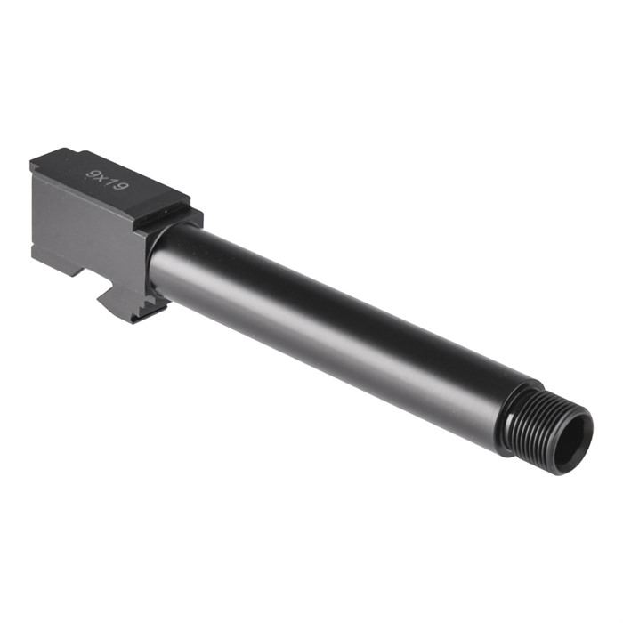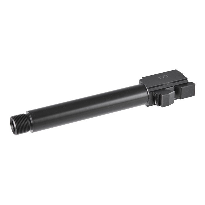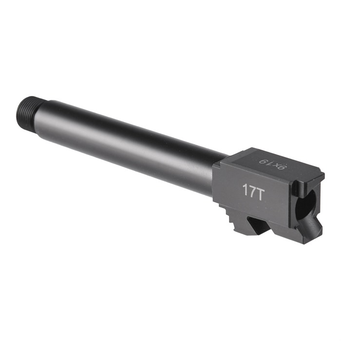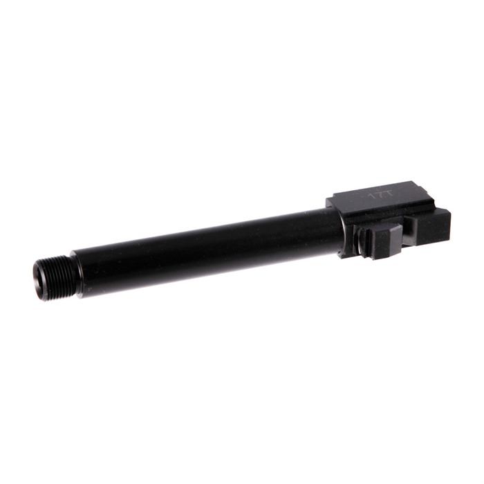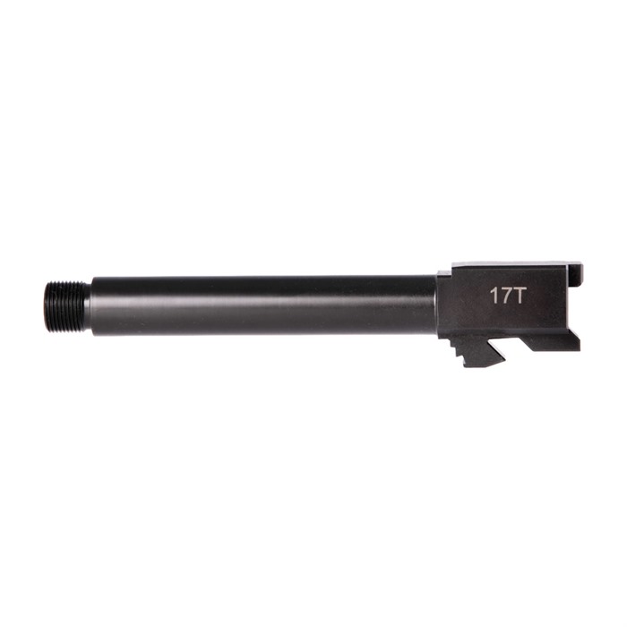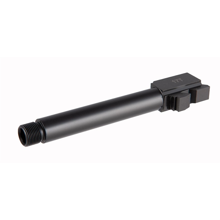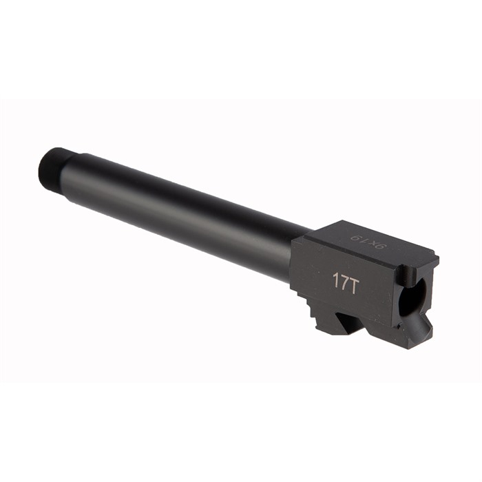 A Brownells Match-Grade Barrel for Glock® 17 is an excellent replacement for a shot-out factory barrel or for completing a custom pistol based on the Glock® platform. One of these barrels is the ideal tube for a gun built on a Polymer80 frame with a Brownells RMR Slide on top! Our Match-Grade Barrel for Glock® 17 is machined from hardened 416R stainless steel to precise dimensions for a tight lockup and long service life. Drop-in fit on most guns. The extra-hard Black Nitride finish resists surface wear and stops in its tracks whatever corrosion might try to challenge the stainless steel. This 9mm Luger (9x19mm) chambered barrel is button-rifled with standard, 1-10" right-hand, 6-groove rifling that is compatible with "practice" ammo with non-jacketed bullets. Fits Glock® 17 Gen1 thru Gen4 Button-rifled 1-10" twist 416R stainless steel Black Nitride anti-corrosion finish Threaded model has 1/2"-28 tpi threads Does not include Thread Protector The match-grade barrel for Glock 17 fits Gen1 thru Gen4 G17 pistols and is available with either a Plain muzzle or Threaded to enable installation of a compensator or sound suppressor. Both have an 11-degree target crown, and each is laser engraved with the chambering and the Glock model it fits.