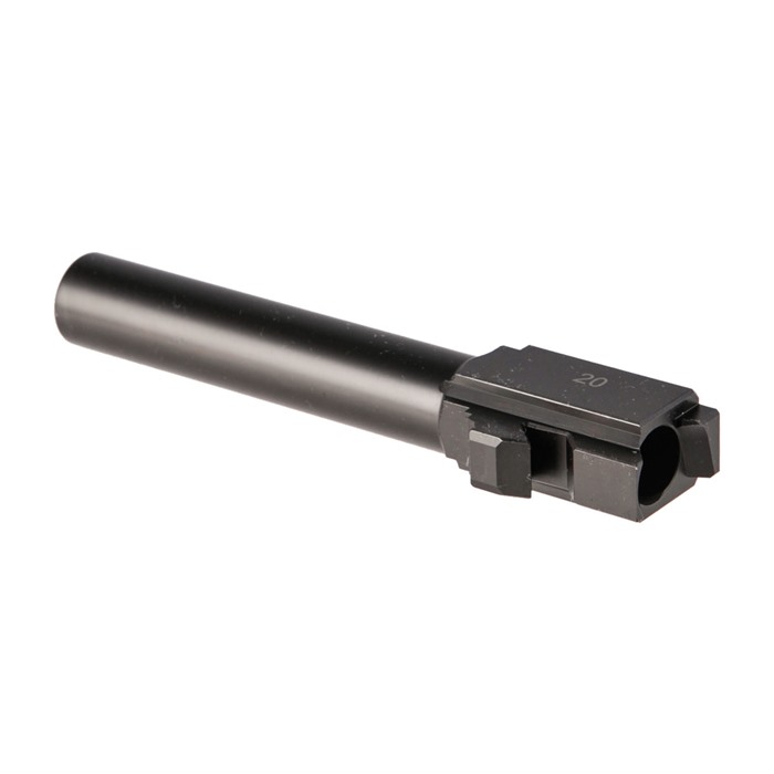 Our Match-Grade Barrel for the Glock® 20 fits ALL generations of G20 It's an excellent replacement for a shot-out factory barrel or for completing a pistol based on the G20 platform. And it's the ideal tube for a custom gun built on a Polymer80 frame with a Brownells Slide on top! Each Brownells Match-Grade Barrel for Glock® 20 is machined from hardened 416R stainless steel to precise dimensions, so it's a drop-in fit on most guns. The tight lockup helps ensure superb accuracy, too. The extra-hard Black Nitride finish resists surface wear and stops in its tracks whatever corrosion might try to challenge the stainless steel. This 9mm Luger (9x19mm) chambered barrel is button-rifled with standard, 1-10" right-hand, 6-groove rifling that is compatible with "practice" ammo with non-jacketed bullets. Fits Glock® 20 Button-rifled 1-10" twist 416R stainless steel Non-reflective Black Nitride anti-corrosion finish Threaded model available with 9/16-24 tpi threads Our match barrel for Glock® 20 is available with either a Plain muzzle with an 11-degree target crown or Threaded (9/16-24 tpi) to enable installation of a compensator or sound suppressor. Both are laser-engraved with the chambering and the Glock model it fits.