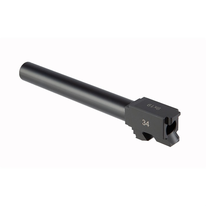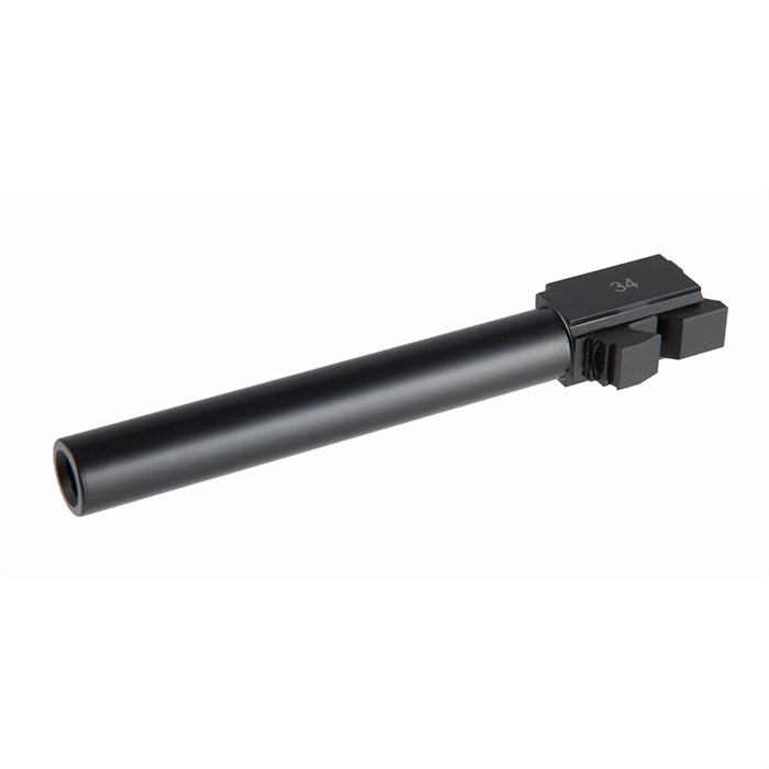 Our Match-Grade Barrel for the Glock® 34 is compatible with ALL generations of Glock's target 9mm pistol, Gen1 through Gen4. These barrels are machined from hardened 416R stainless steel to precise dimensions for a tight lockup that helps ensure superb accuracy. Drop-in fit on most guns, too. An extra-hard Black Nitride finish resists surface wear and stops in its tracks whatever corrosion might try to challenge the stainless steel. This 9mm Luger (9x19mm) chambered barrel is button-rifled with standard, 1-10" right-hand, 6-groove rifling that is compatible with "practice" ammo with non-jacketed bullets. You can get a Brownells match-grade barrel for your Glock® 34 with either a Plain muzzle with an 11-degree target crown or Threaded (1/2"-28 tpi) to enable installation of a compensator or sound suppressor. Both are laser-engraved with the chambering and the Glock model they fit. Fits Glock® 34 Gen1 thru Gen4 Button-rifled, 6-grooves, 1-10" twist Hardened 416R stainless steel Non-reflective Black Nitride anti-corrosion finish Threaded model has 1/2"-28 tpi threads A Match-Grade Barrel for Glock® 34 from Brownells is an excellent replacement for a shot-out factory barrel or for building a pistol based on the G34 platform. And it's the ideal tube for a custom gun built on a Polymer80 frame with a Brownells RMR Slide on top!