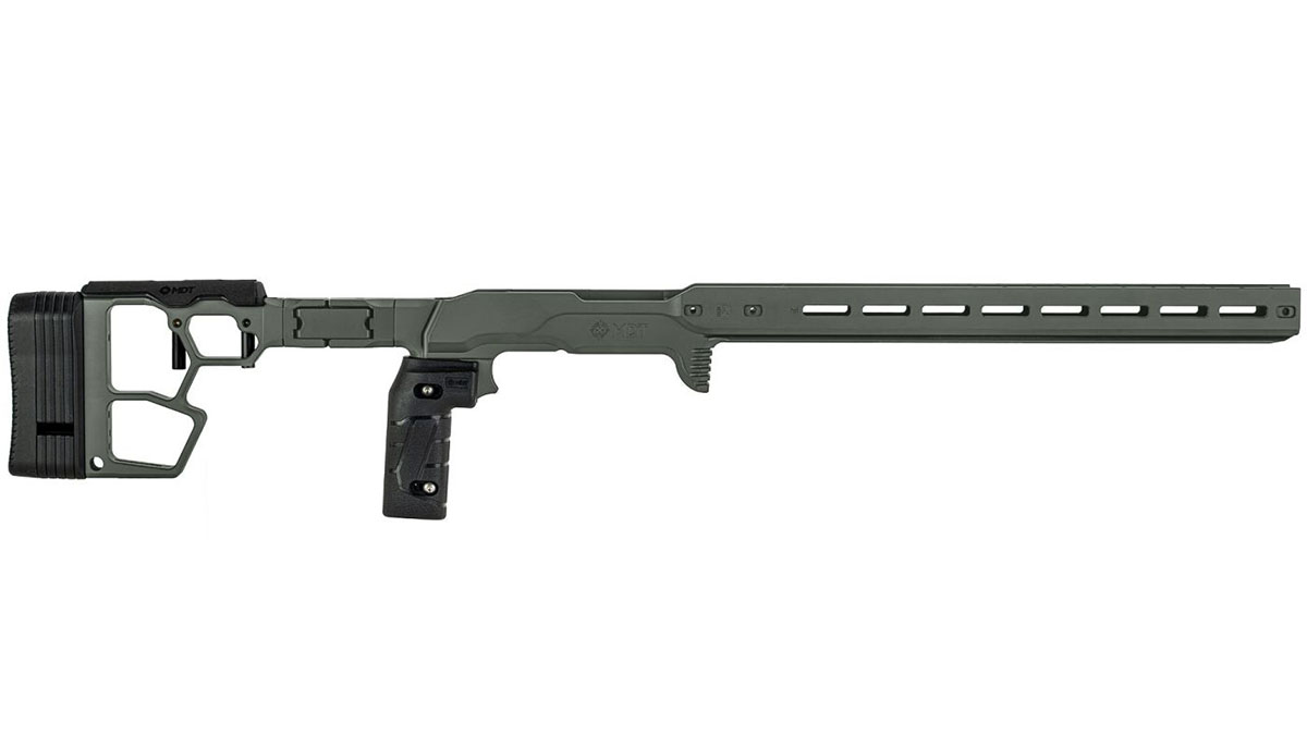 Das ACC Premier GEN2 Folding System von MDT ist die neueste Entwicklung des branchenführenden ACC Premier und integriert Fortschritte, die vom ACC Elite inspiriert sind. Mit einem höheren, integrierten Barricade Stop, einem dickeren und stabileren Forend sowie präzise gebohrten Löchern für NV- und Control Bridge-Kompatibilität hebt dieses Chassis die Messlatte für das Wettbewerbsschießen.