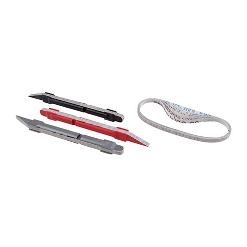 Es funktioniert sowohl auf Metall als auch auf Kunststoff. Jedes Kit enthält 3 Schleifdetailer sowie 15 Micro-Finishing Film Bänder; 5 Bänder mit 3 unterschiedlichen Körnungen: