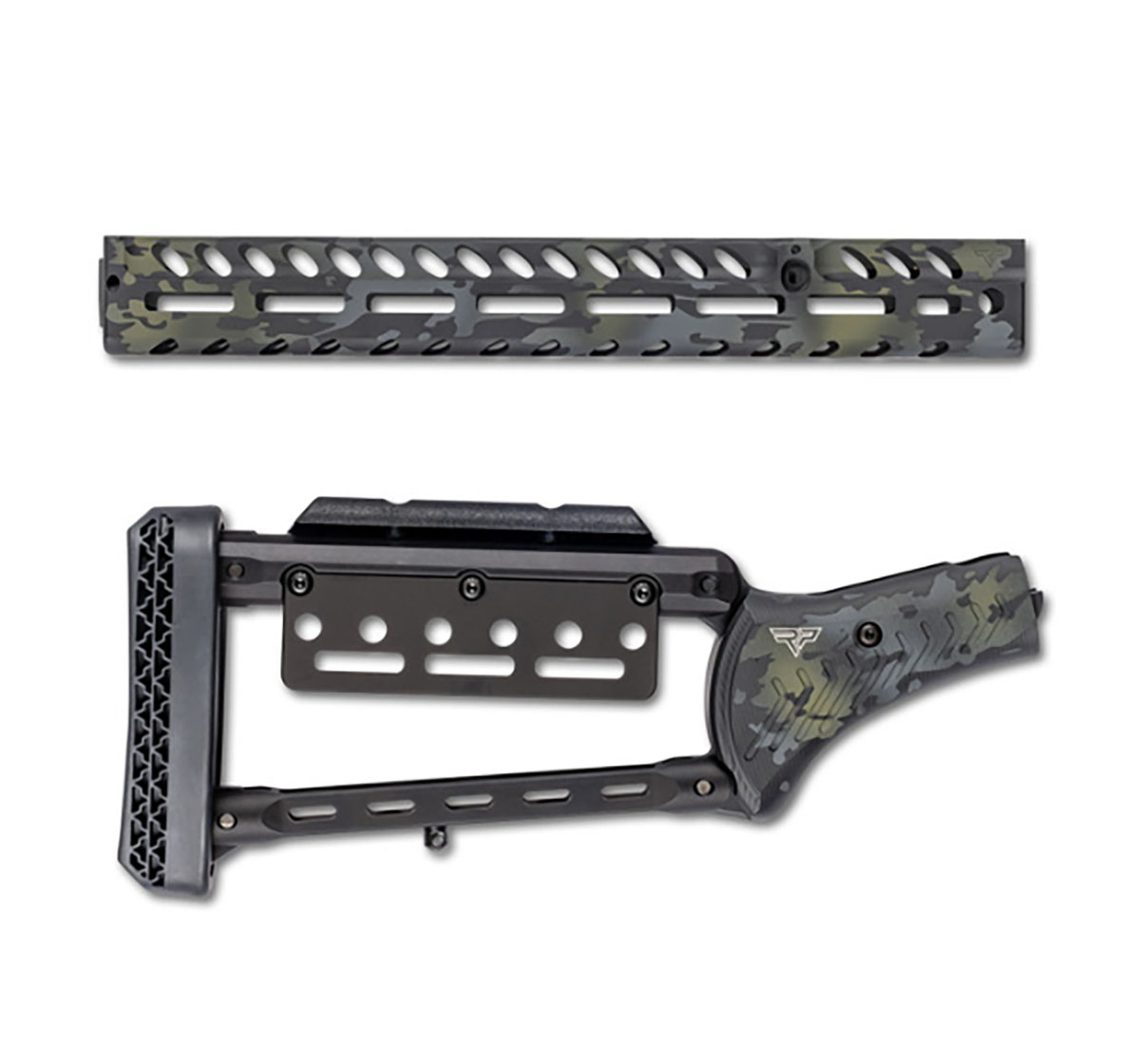 850078134165 Marlin Lever End Cap and Pistol Grip Stock Set – Black Multicam Material: 6061-T6 aluminum – lightweight, durable, and weather-resistant Finish: Black Multicam Cerakote – stylish and highly durable Weight: 624 g (Handguard 375 g, Stock 249 g) 1. Ranger Point Gen 2 Handguard (End Cap) Length: 33.7 cm (13.25 inches) Features: M-LOK accessory slots on the sides and bottom QD sling swivel ports and a threaded hole for a traditional sling stud Textured cutouts for optimal control Mounting: Includes tenon, screws, and installation hardware 2. Ranger Point Pistol Grip Stock Design: Adjustable cheek height with 4 pivot points for iron sights, red dots, or scopes AR-compatible 6-position butt plate with “Dead Blow” recoil reducer Weight: Only 623 g (22 oz) – lighter than standard stocks for perfect balance Length: Adjustable length of pull using 1.27 cm (½ inch) spacersNachbestellt, Lieferzeit ca. 3-4 Monate aus dem Lager Europa.
