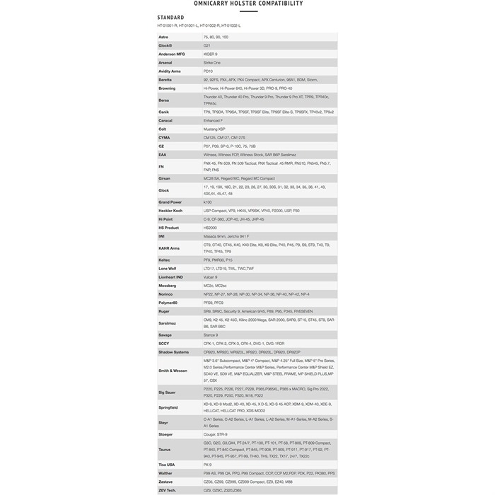 OMNICARRY MULTI-FIT OUTSIDE-THE-WAISTBAND HOLSTERS Features Universal Fit Consealed Carry Holster Outside Waist Band, Fits over 300 Handguns Superior Retention Use with Fullsize, compact and sub-compact pistols Adjustable Retention Plate Secure and comfortable fit with foam & mesh backer, Belt attachment with two pre-installed high strength Tegris belt loops Fitted for all slide mounted optics
