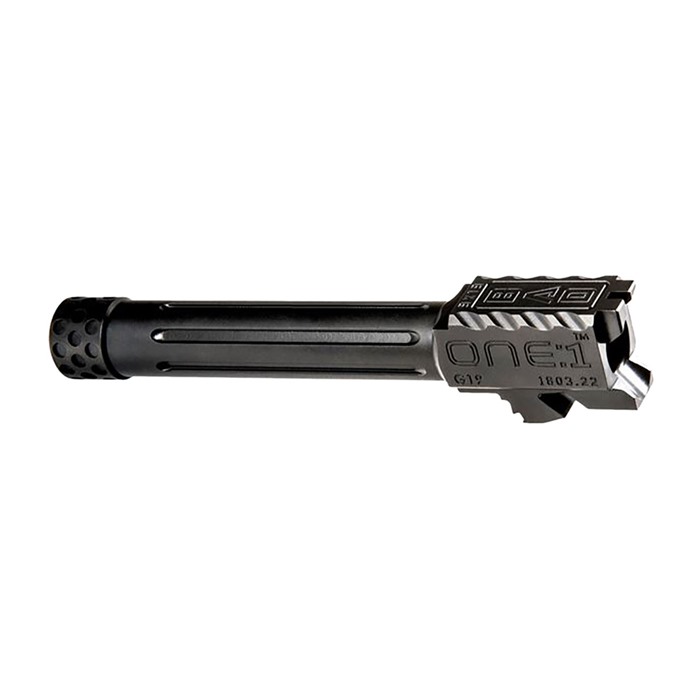 ONE:1 utilizes revolutionary machining process where one machine comprehensively machines every part of the barrel from the beginning to the end. The process includes the ultra-precise single point cut rifling where the rifling is done with almost a hundred minuscule cuts. This method does not introduce stress to the barrel and no stress relieving is necessary after rifling. Perfect concentricity between the chamber, bore, and rifling. This process also yields uniform twist rate and ultra-accurate rifling grooves with a deviation of less than .0001in from groove depth to groove depth. Material: Heat Treated 416R Stainless Threading Options: None or 1/2 x 28 Thread Fluting: Straight Finish: Melonite QPQ Black Nitride or Stainless Steel Twist Rate: 1:10 Crown: 11° Target Crown Length: 4.5” O.A.L. W/O Thread Protector Fits: GLOCK 19~ / Gen 3, 4 & 5 / Glock 19X~ Made In USA Rated for +P ammunition Threaded Version Comes with a SABERTUBE® Dimpled Patterned Thread Protector with O-Ring.