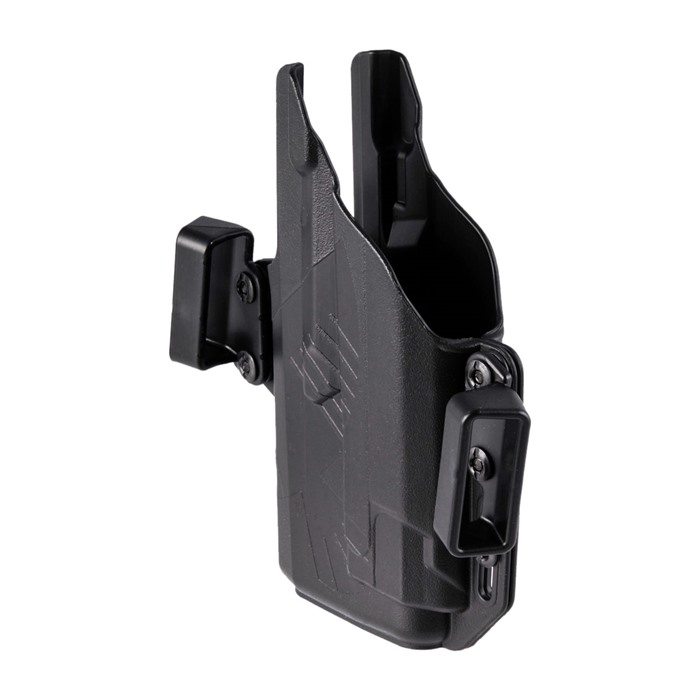 Die körpernahe Krümmung dieses Holsters wird durch modulare Gürtelschlaufen erreicht. Jedes Holster enthält drei Paare von 1,5”-Gürtelschlaufen (LH 10 Grad Neigung, RH 10 Grad Neigung und ambi 0 Grad Neigung), die es dem Benutzer ermöglichen, den beidhändigen Holsterkörper für Links- oder Rechtshänder zu konfigurieren, mit entweder einer 0-Grad- oder 10-Grad-Neigung.