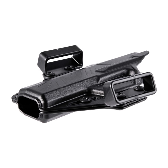 Die körpernahe Krümmung dieses Holsters wird durch modulare Gürtelschlaufen erreicht. Jedes Holster enthält drei Paare von 1,5” Gürtelschlaufen (LH 10 Grad Neigung, RH 10 Grad Neigung und ambi 0 Grad Neigung), die es dem Benutzer ermöglichen, das ambidextröse Holster für Links- oder Rechtshänder zu konfigurieren, entweder mit 0-Grad- oder 10-Grad-Neigung.