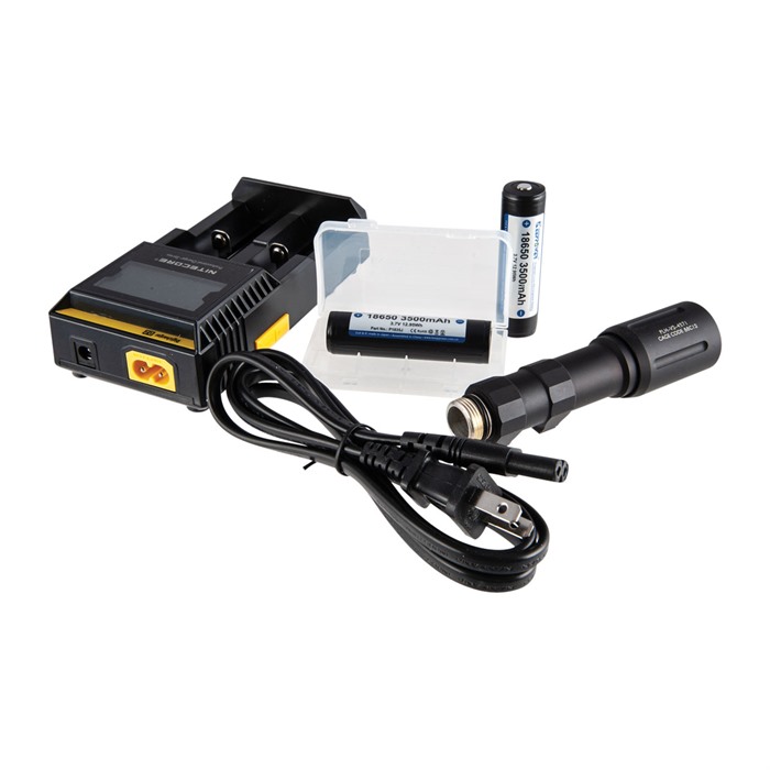 Das Modlite PLHv2 18650 Waffenlicht-Paket enthält einen PLHv2-Lichtkopf, einen 18650-Körper und die Option mit oder ohne Tail Cap. Außerdem ist eine KeepPower 3500mAh 18650-Batterie sowie ein XTAR MC2 Ladegerät enthalten. (Artikel 100-042-503 enthält keine Tail Cap oder Ladegerät.)