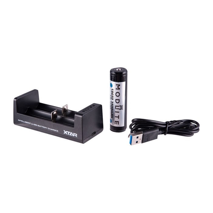 Dieses Modlite PLHv2 18650 Waffe-Lampe-Paket enthält einen PLHv2-Lampen-Kopf, einen 18650-Körper und die Option auf einen Tail Cap oder ohne Tail Cap. Außerdem ist eine einzelne KeepPower 3500mAh 18650-Batterie und ein XTAR MC2-Ladegerät enthalten. (Artikel 100-042-503 enthält keinen Tail Cap oder Ladegerät.)