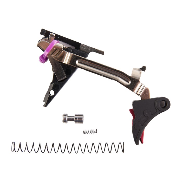 Im Lieferumfang des Zev Technologies Pro Face Trigger Drop-In Kits für die Glock Gen 4 sind enthalten: Abzug, Abzugsstange, Abzugsblock, Auswerfer, Connector, Abzugfeder und ein leichter Sicherheitsplunger aus Edelstahl sowie eine Feder, um den Abzug weiter zu verfeinern. Es kommt mit einer reduzierten Schlagfeder, um ein leichteres Gefühl beim Abzug für den Wettkampf zu erzeugen, sowie der Werksschlagfeder für den täglichen Einsatz und Dienst.