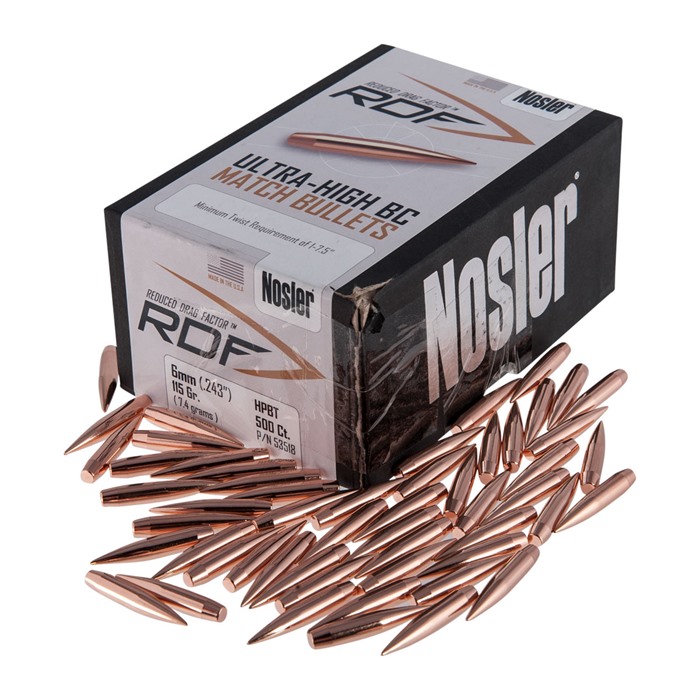 Flattest Shooting Match Bullet On The Market For those wanting to squeeze the most performance from their competition rifle, Nosler’s new RDF (Reduced Drag Factor) match bullet line is the ideal choice. Nosler’s RDF line was designed from the ground up to provide exceptionally high BCs, which create the flattest trajectory and least wind drift possible. The keys to the RDF’s outstanding performance are Nosler’s meticulously optimized compound ogive and long, drag reducing boattail, which make handloading a snap and create an incredibly sleek form factor. RDF bullets also have the smallest, most consistent meplats of any hollow point match bullet line, so there is no need to point or trim tips. Highest B.C.’s, smallest meplat, tighter groups – Nosler RDF.
