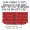 Wenn du an Bolzen, Läufen oder Choke-Rohren arbeitest, kannst du einfach die Kiefer umdrehen und die Nut finden, die am besten zu deinem Projekt passt. Das Sichern von zylindrischen Objekten kann ohne das richtige Werkzeug schwierig und frustrierend sein.