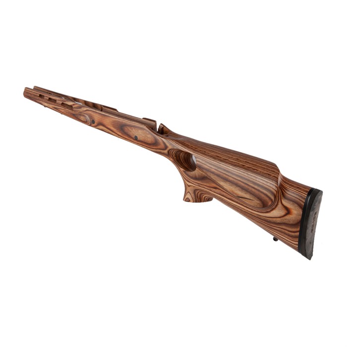 Featherweight Thumbhole Remington 700 BDL Long Action Factory Barrel Channel in Nutmeg Laminate The FT's design is a synthesis of design elements requested by you, the customer, for a thumbhole design. With a large rollover cheek piece for scope usage and straight comb design to minimize cheek slap when shooting, the hand conforming thumbhole allows for increased accuracy while distributing the recoil among the palm and shoulder thus minimizing muzzle jump and felt recoil. The forend is proportioned to nicely complement barrels from 21 inches to 25 inches in length and will accommodate barreled actions with standard sporter contour barrels. Larger barrels up to a tapered varmint design can be inlet in these stocks. The forend also has side vents which permit the free floating barrel to cool efficiently for those long days at the range.