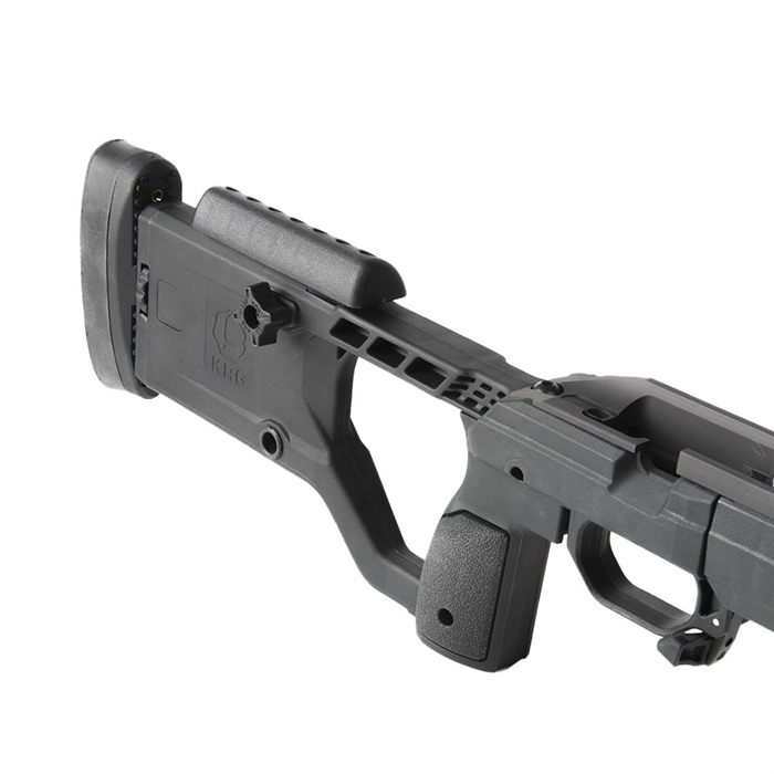 X-Ray Chassis (Generation 4) Unprecedented value...This is what the X-Ray chassis provides to you. When you pick up the X-Ray, it will feel nice and light compared to other chassis. You'll have nearly identical ergonomics to the Whiskey-3 with only a little more time involved in adjusting the different aspects like the length of pull. Furthermore, you'll have all the standard benefits of a chassis like the use of AICS magazines, a variety of mounting points for slings, barrier stops, etc., and aluminum block bedding for the action while not having to sell off a kidney to pay the price of admission. To accomplish Kinetic Research Group’s design intent, we kept the features that everyone wants and needs and eliminated those that weren't necessary. Then they utilized efficient manufacturing processes to keep production costs down and in turn keep the price to the shooter down. The end result is a hybrid aluminum and polymer chassis that we think you'll love. Kinetic Research Group is proud to present the X-Ray chassis, the result of years of careful design, thought, refinement, and hard work. The change is a new one piece backend, which comes standard with tool-less buttpad height and cant adjustment, as well as a ambidextrous cheekpiece thumbscrew. All KRG’s chassis take AICS magazines with nothing extra needed, the magazine is not included. Note: Actions with trigger hangers will not work without mods to the chassis, hanger, or both.