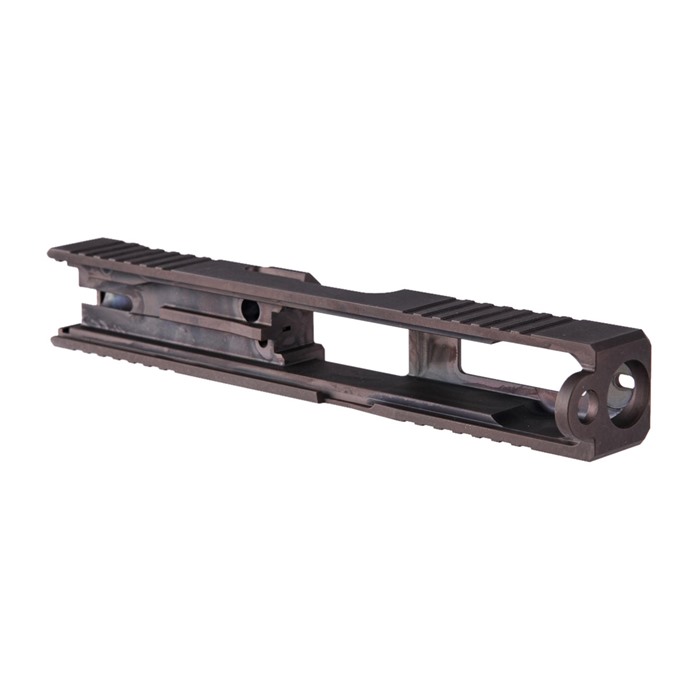 The limited production Brownells Brown RMR Slide for Glock® 19 Gen3 pistols features a pre-cut slot for easy, secure, low-profile mounting of a Trijicon RMR or Holosun red dot sight. Up front, there are distinctive, cocking serrations that aid in manipulating the slide to check the chamber or clear a jam. And we’ll admit it: the serrations just look cool, too. All RMR Slides also have standard Glock® factory front and rear sight dovetails for "iron" sights. To get proper co-witnessing with the RMR, you will need to also install suppressor-height iron sights. These limited production Brownells Brown slides for the Glock® 19 Gen3 come with a "window" cutout on top between the front serrations that enhances airflow to keep the barrel cooler - ideal for hard-working action competition pistols. Plus, if you have an upgraded barrel with a contrasting finish or a unique exterior pattern (fluting, spirals, "flames," etc.) the window lets you show it off a bit! A Brownells RMR Slide is the ideal upgrade for your factory Glock® 19 Gen3 OR the perfect "top half" for a brand-new custom gun built on a Polymer80 80% frame. Fits Gen3 Glock® 19 pistols & clones Built-in Trijicon RMR mounting slot Also accepts Holosun HE508T, HS507C & HS407C red dot sights Factory front/rear iron sight cuts, too Machined from corrosion-resistant 17-4 stainless steel billet Each RMR Slide for Glock® starts life as a billet of 17-4 stainless steel that is machined to Glock® factory specifications inside, so it’ll accept factory or aftermarket barrels and internal parts. Each slide is heat-treated to Rc 41-44 on the Rockwell C scale for added surface hardness and wear resistance. The Brownells Brown slide is a limited production and once they are gone, they’re gone. Brownells Gun Tech™ Note: Channel liner required for these slides. Channel liner is a press fit and requires a tool to install. We recommend #777-100-017. Includes patented optic cut technology pioneered by ZEV Technologies. Patent No. RE47335