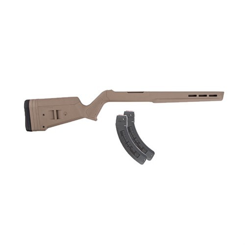 High-quality Ruger® factory magazines deliver optimal performance from your 10/22®, short action rifle, and long action rifle. Molded hard-polymer body, stainless steel feed lips, high-grade tempered spring steel spring help ensure reliable feeding and extra-long service life. Magpul's 10/22® Hunter X-22 stocks are reinforced polymer construction for strength and durability. Optimized grip angle and forend shape provides improved ergonomics. Adjustable LOP with included spacers and optional cheek risers for comb height adjustment. Drop-in design requires no gunsmithing. Reversible barrel tray accepts all factory lightweight and match bull barrels. Multiple sling mounting options and M-LOK compatible for additional accessories. Non-slip rubber butt-pad.
