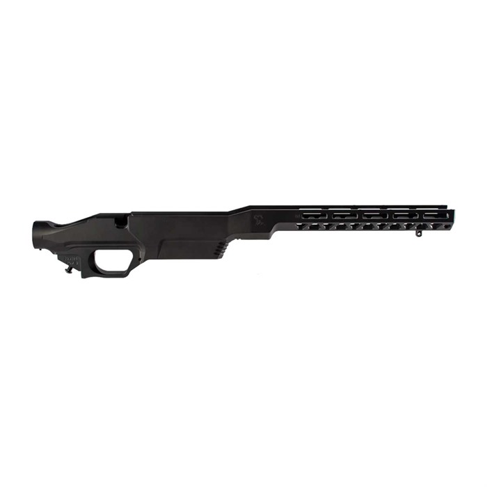 Das Chassis besteht aus 6061 Aluminium und verfügt über ein V-förmiges Bettsystem, das die meisten schweren Läufe aufnimmt. Das Bettsystem sorgt dafür, dass die Gewehrläufe frei schwingen können, um maximale Genauigkeit zu gewährleisten.