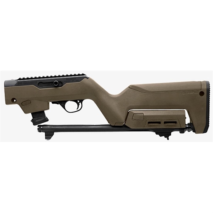 When the Backpacker Stock first emerged for the popular Ruger 10/22®, enthusiasts flocked to the streamlined design that made takedown models of the 10/22 easy to carry. Now, that same functionality is available to owners of the Ruger PC Carbine®, which operates with the same quick-takedown mechanism as the 10/22. This Magpul Backpacker Stock provides ultimate portability and provides many of the same features found in the original X-22 Backpacker. You'll find the same interface that locks the two separate halves of the gun together for transport and storage, and there are M-LOK attachment slots on the forend that make adding accessories a breeze. Ruger® models equipped with chassis and/or tubular handguards utilize a Modular Handguard Mount which will need to be replaced by the end user with a standard Takedown Block in order to mount the Magpul Forend. Each Magpul PC Carbine® Backpacker Stock includes two storage locations, one found in the water-resistant grip and the other in the cheek riser that accommodates storage for a single pistol magazine. The size of this rear compartment will accommodate magazines up to the size of Magpul's PMA 21 GL9. This drop-in stock fit is designed to work with PC Carbines chambered in 9mm and .40 S&W, and there are interchangeable cheek risers that will work for mounted optics. A non-slip rubber butt pad ensures shooting comfort, and you can add an additional 3/8-inch insert to adjust the length-of-pull.